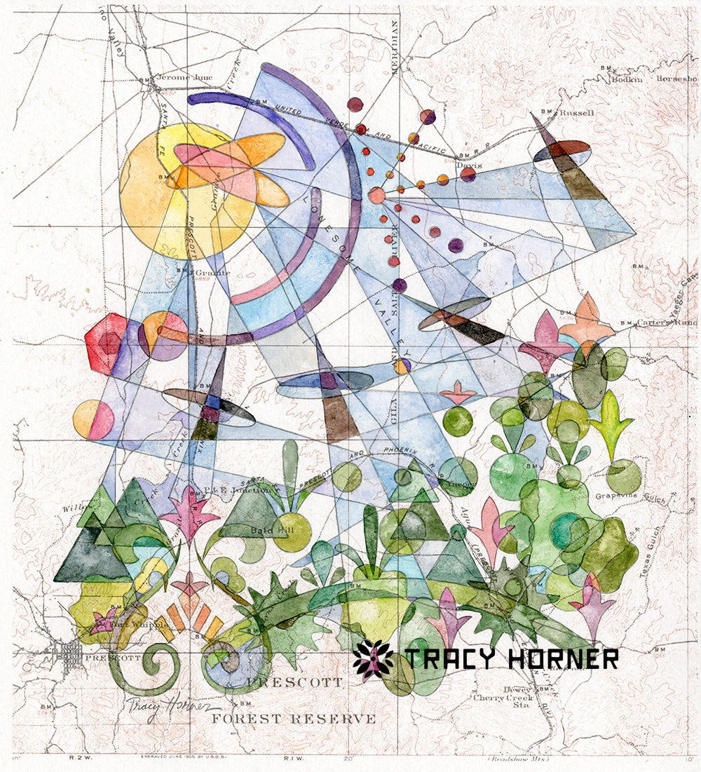 Abstract landscape painted in watercolor on a background of a historic Arizona topo map.