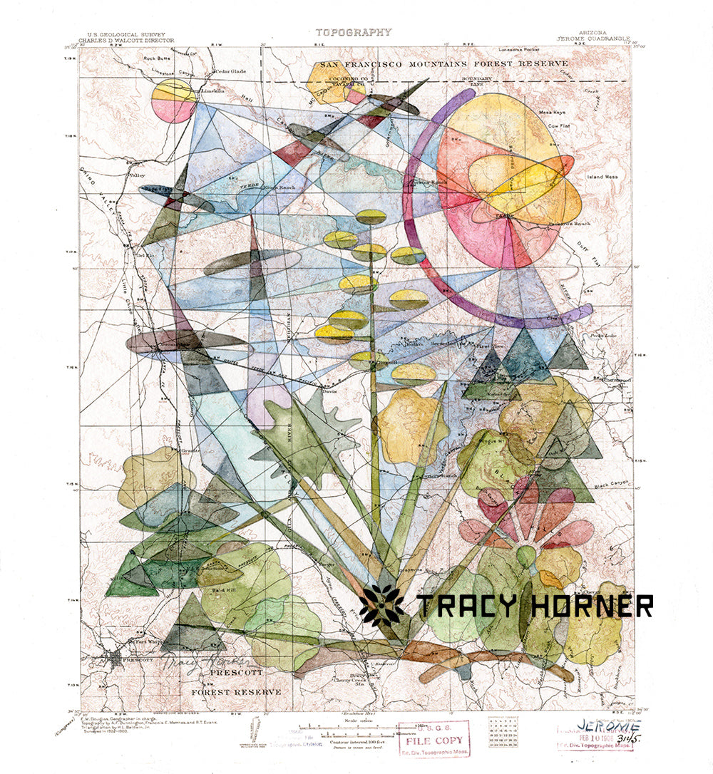 Abstract landscape painted in watercolor on a background of a 1906 Arizona topo map.
