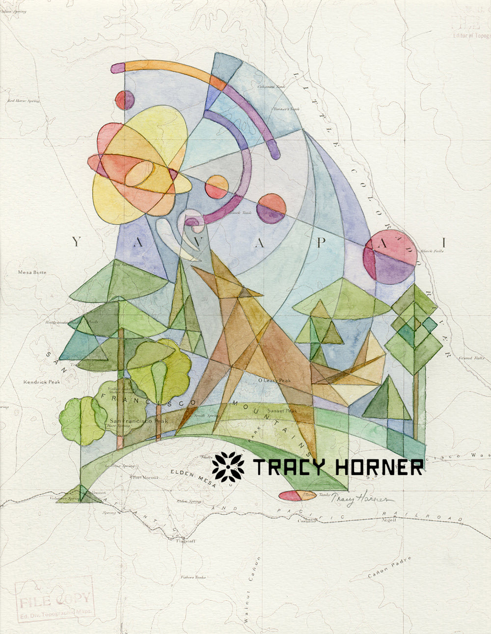 Abstract landscape painted in watercolor on a background of a 1891 Arizona topo map.