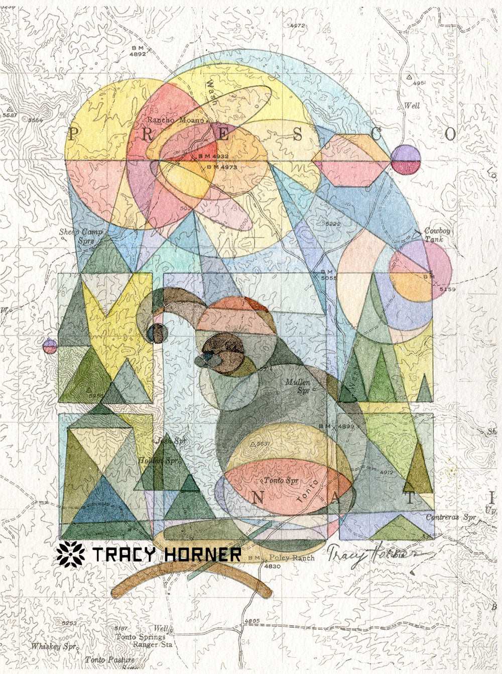 Abstract landscape painted in watercolor on a background of the 1949 Iron Springs Quadrangle just north of the town of Prescott, Arizona.