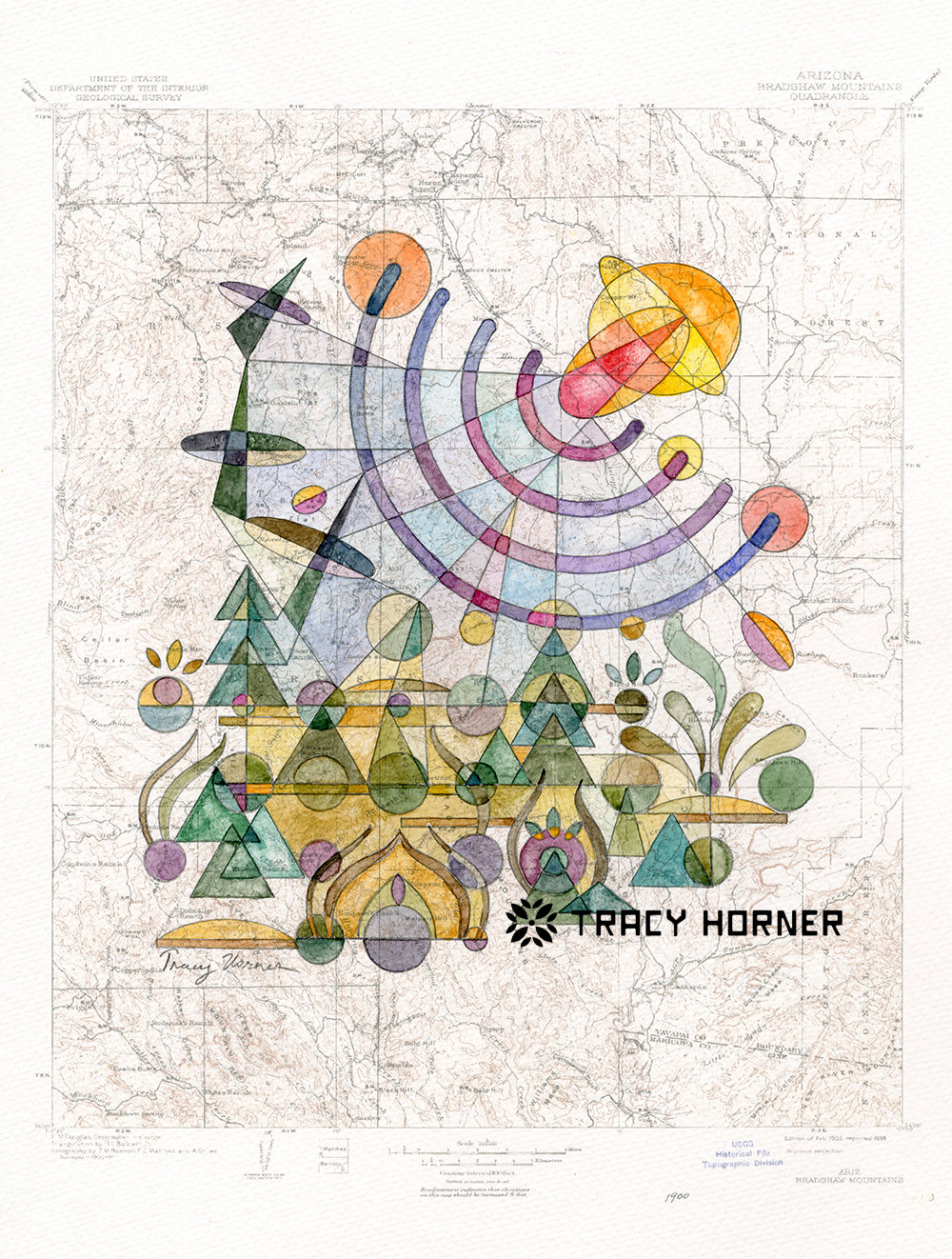 Abstract landscape painted in watercolor on a background of a 1903 Arizona topo map.