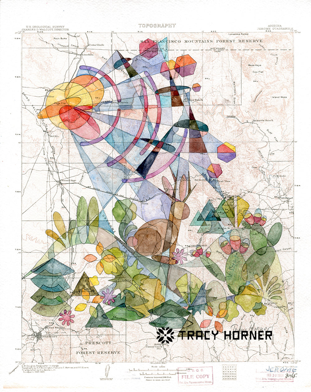 Abstract landscape painted in watercolor on a background of a 1905 Arizona topo map.