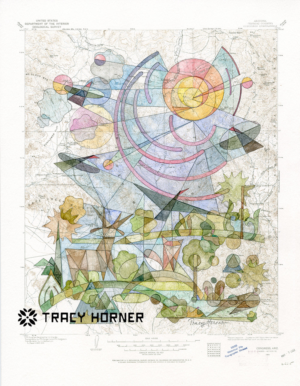 Abstract landscape painted in watercolor on a background of a historic Arizona topo map.
