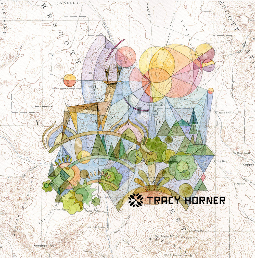 Abstract landscape painted in watercolor on a background of a 1927 Arizona topo map.