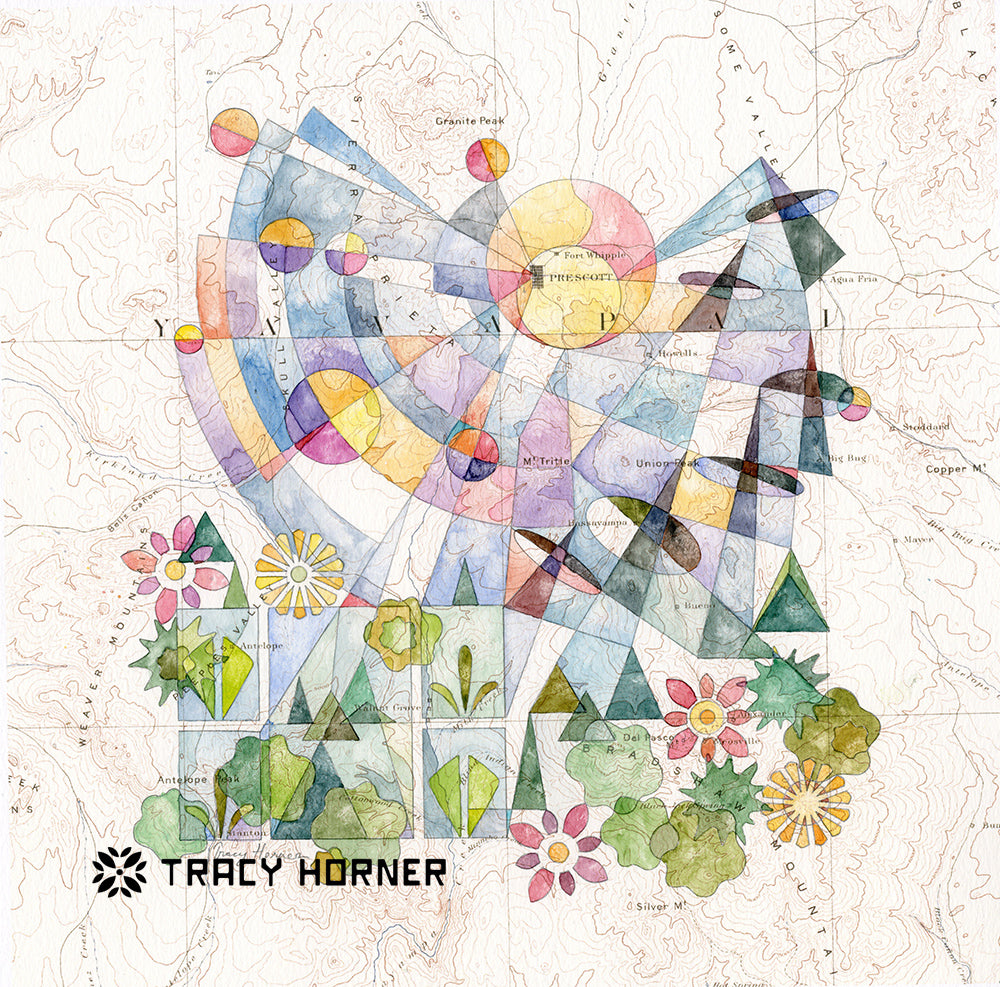 Abstract landscape painted in watercolor on a background of a 1887 Arizona topo map.