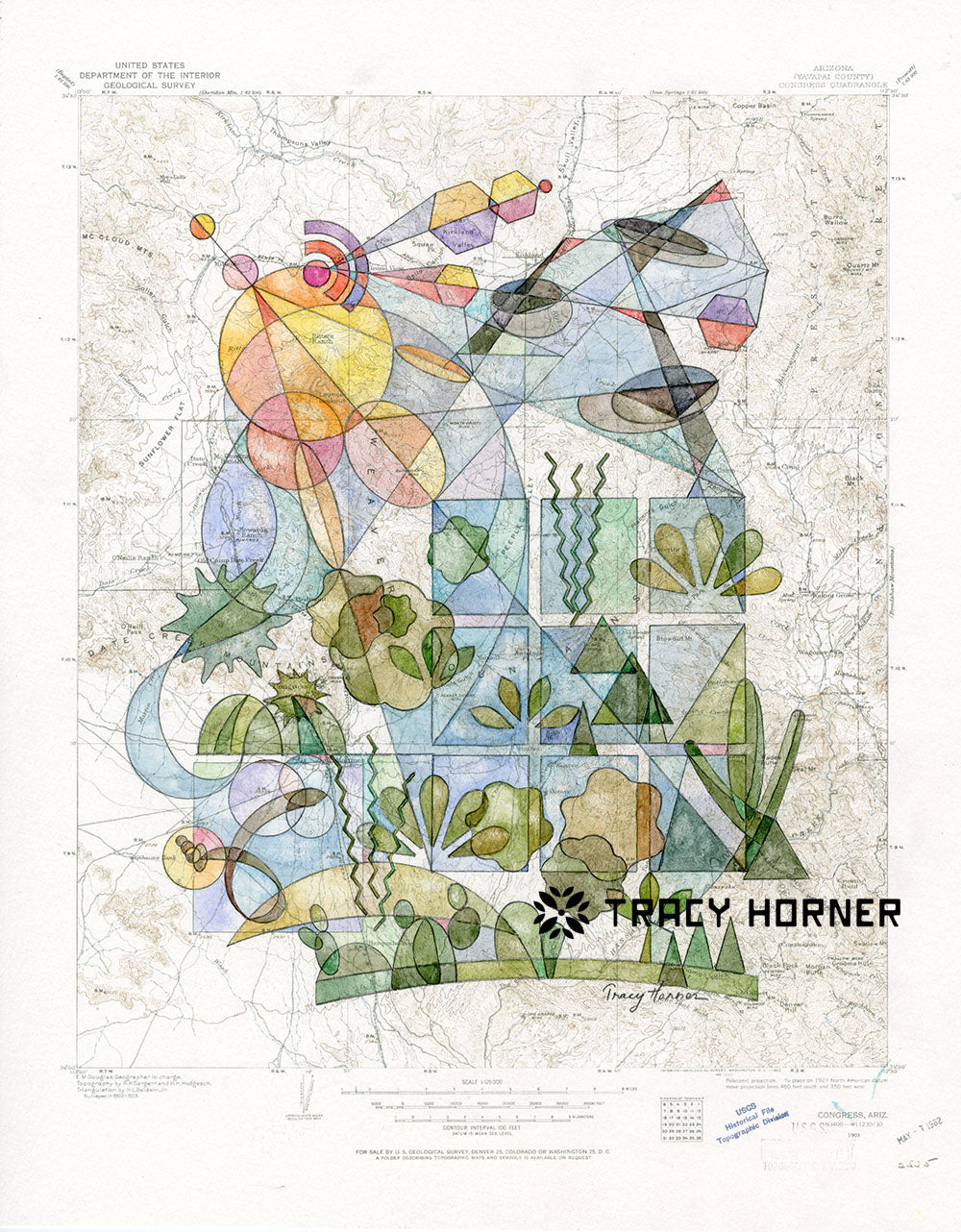 Abstract landscape painted in watercolor on a background of a 1903 Arizona topo map.