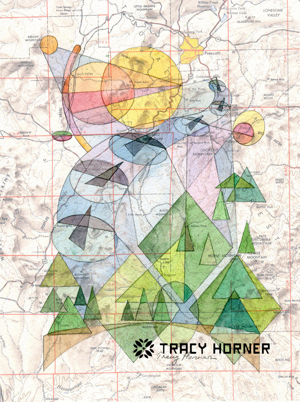 Abstract landscape painted in watercolor on a background of a historic Arizona topo map.
