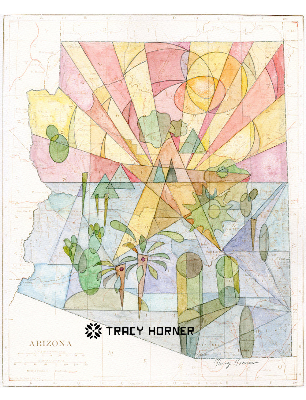 Abstract landscape painted in watercolor on a background of a 1921 Arizona map found in the 1921 edition of Collier's Encyclopedia. This was the first edition that showed the transition from Arizona Territory to our 48th state in 1912.