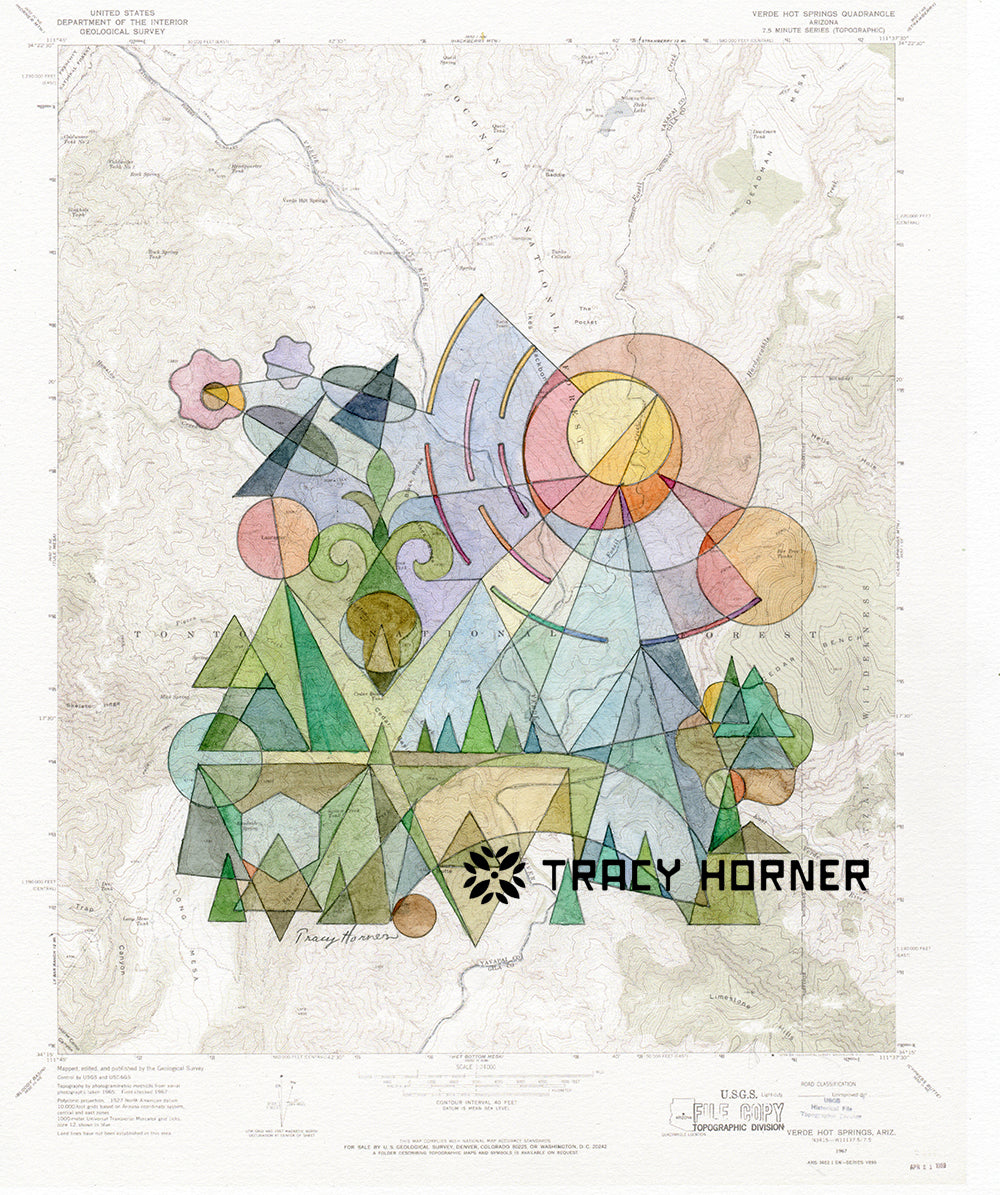 Abstract landscape painted in watercolor on a background of a 1967 Arizona topo map.